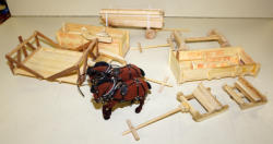 about 1/16th scale, horses are flocked with leather harness; wagons are all handmade, mostly from paint stir sticks, pretty nice, but could use some finishing, sells as a set for one money