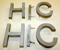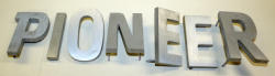 each letter is 6.25" tall and about 3/4" thick, not sure if it's Pioneer Seed Corn or what, but a nice looking set