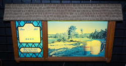 66" long, 19" tall, lights up and motion works, believe the clock works too, small chip on the corner of the roof, otherwise some normal wear, but overall a nice original & hard to find sign; no shipping, local pickup only