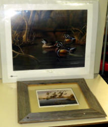 large one is 23"x19" and sealed in plastic, 294/500, signed "Wooded Haven"; small one is in barn wood frame, 19"x17", 1237/2000, signed, "Evening Flight"; sell 2x the money