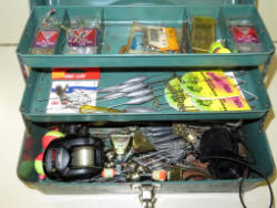 Great looking display with some awesome vintage lures! Mounted to the inside w/some fish netting, glass face, 24"x18"; includes Heddons, Lazy Ikes, Spinners, Mouse & More! NO SHIPPING, Local Pickup only