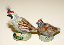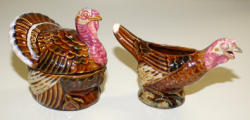 Rooster is 7.25" tall and mint; Hen has been professionally repaired on the beak, sells as a set