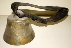 Barinotto Chinate & Co. 10” diameter brass bell with excellent original leather strap and buckle; unique and a sweet sound, belt is 4.5" across!