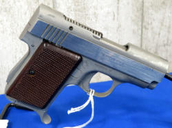 2.5" Stainless barrel; wood checkered grips and also includes original black plastic checkered grips; SP soft leather holster w/magnet flap; one magazine; USA; SN#A95439; A-155