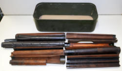 includes 11 wood stocks, 4 wood forearm halves, 6 wood pistol grips, 2 plastic buttstocks, 1 set fiberglass forearms; sell for one money