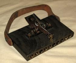 Very unique piece, cast brass that you could load up to 10 barrels with a trip to hit the percussion cap. Measures 6"x3.5", no maker's mark