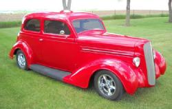 GM Crate 350, auto, mild comp cams camshaft, Edelbrock alum intake, 4bbl Edelbrock carb, & Sanderson Block hugger headers w/ dual exhaust. Turbo 350 trans. 100% steel, restored to show quality Brandy Wine pearl paint. Complete custom interior w/ power windows, excellent sound system & custom gauges. Cold AC! Stock frame reinforced w/ ind. front suspension, tubular A-arms w/ coil covers, 9" Ford rear w/ 4-link suspension & aluminum coil covers. Best running & driving street rod you'll find. Runs cool on hot days w/ the AC on