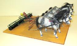 Breyer horses, full custom harness, implement is made of metal and looks good, cart is a little crude, but rest looks nice, all mounted to a board