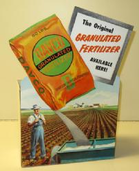 Super piece, made of heavy cardboard, super color and graphics; has a wheel inside with real granules of fertilizer that spins to look like the fertilizer is coming out of the bag; never used, cord is still wrapped from the factory! 17.5" tall, 13" wide; super piece
